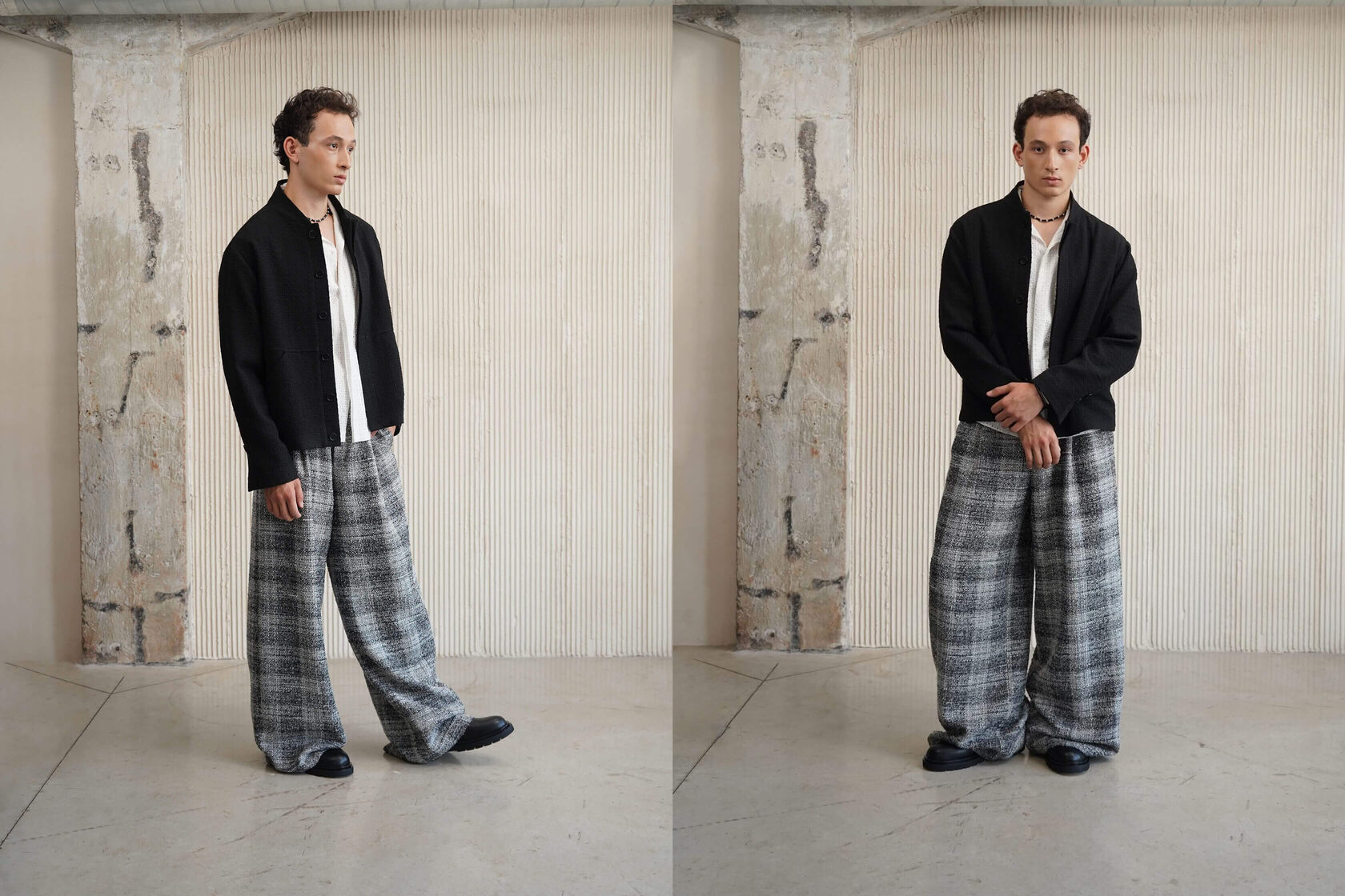 1 нарядная вещь (Палаццо «Eugene» в сером цвете с принтом клетка) + 2 спокойные (Бомбер «Leo» в чёрном цвете и молочная рубашка «Jude»)