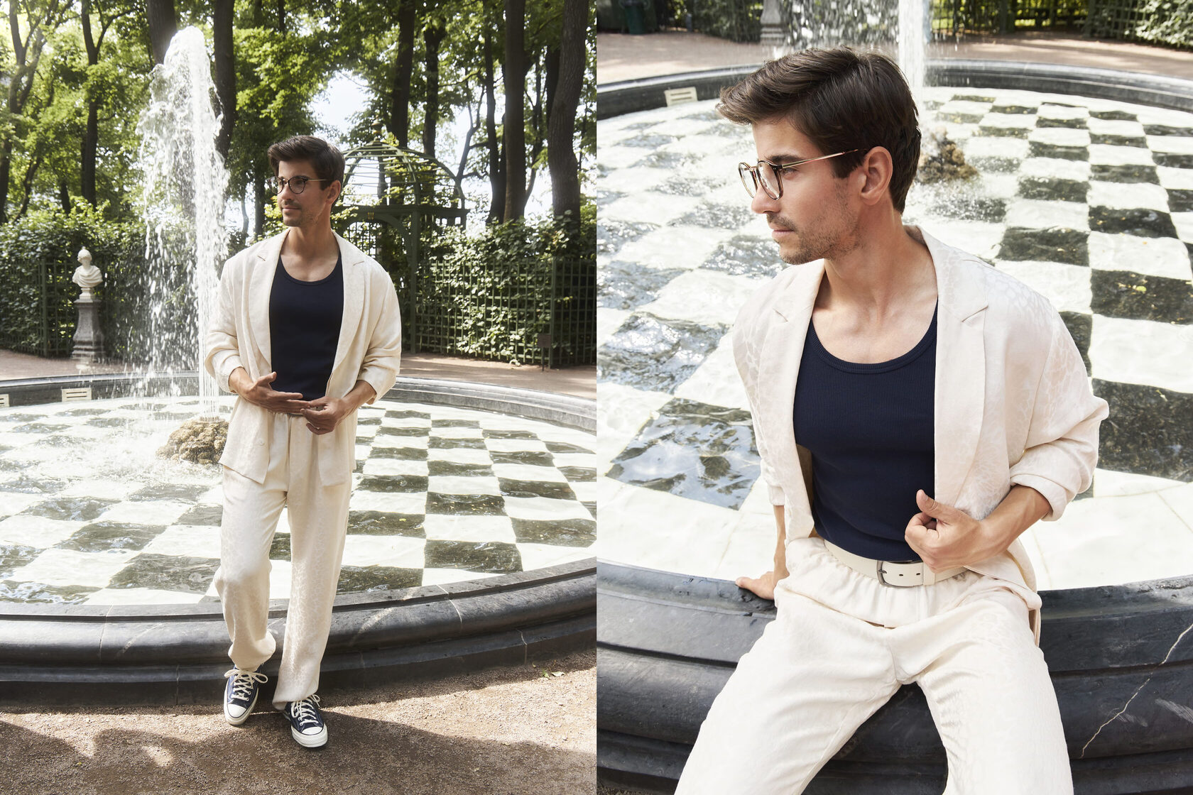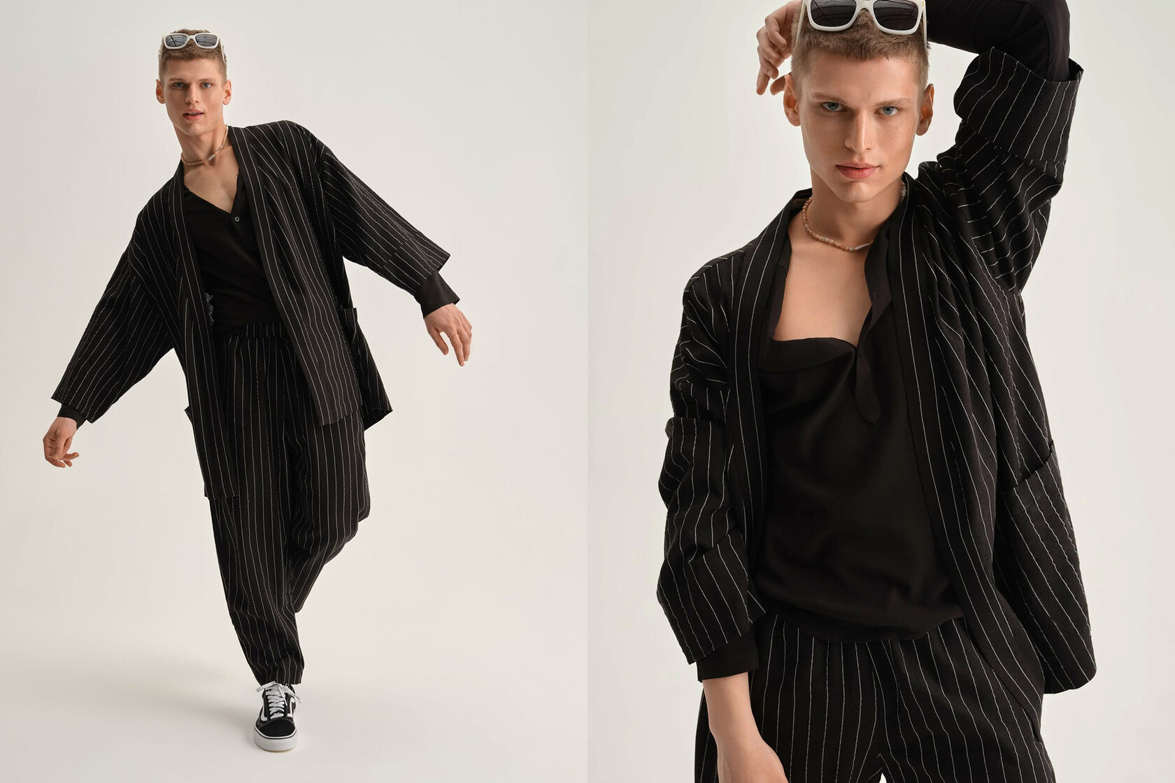 1 нарядная вещь (Костюм «Damiano» чёрный в белую полоску) + 2 спокойные (Рубашка «Johnny» в чёрном цвете и Кеды Vans)