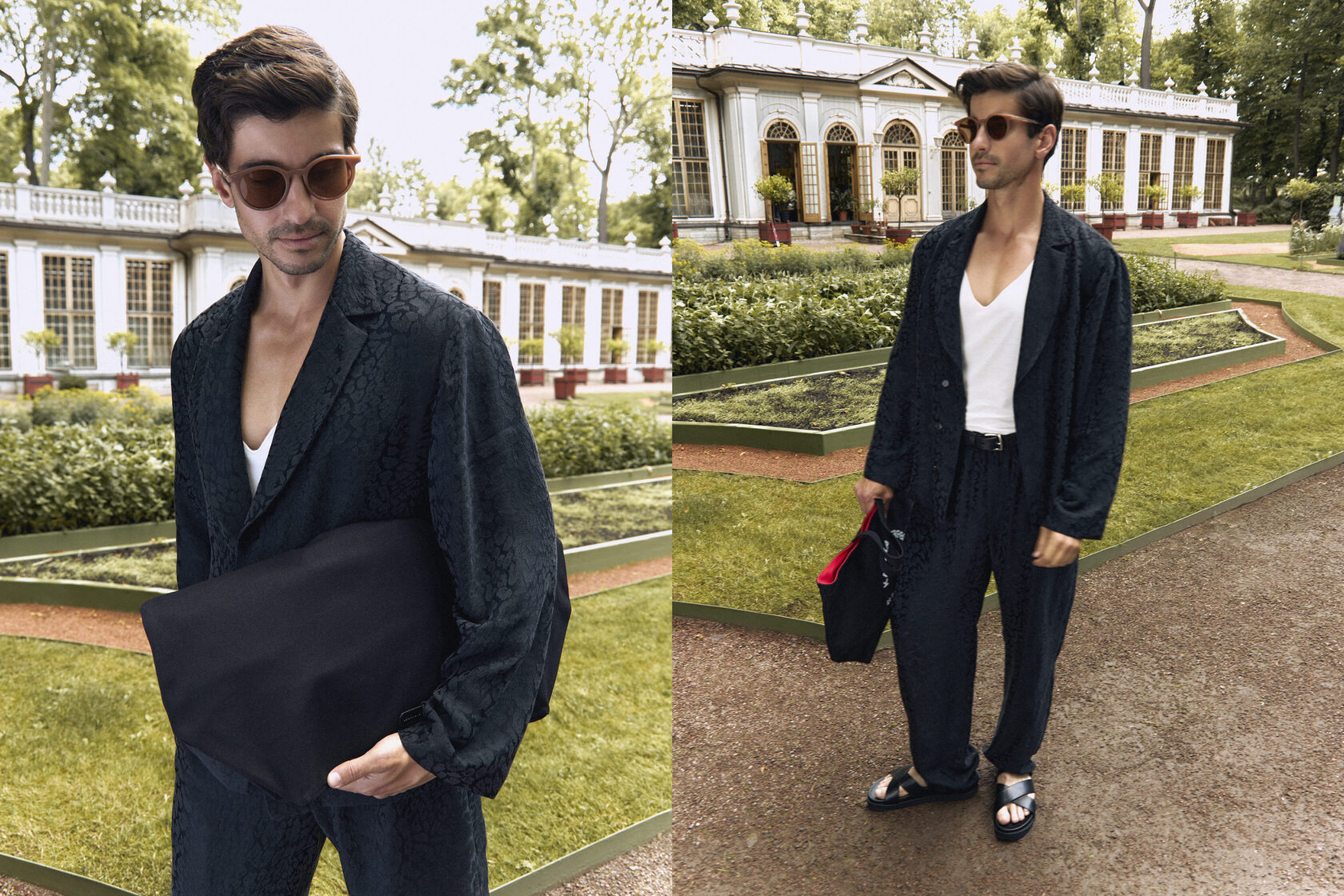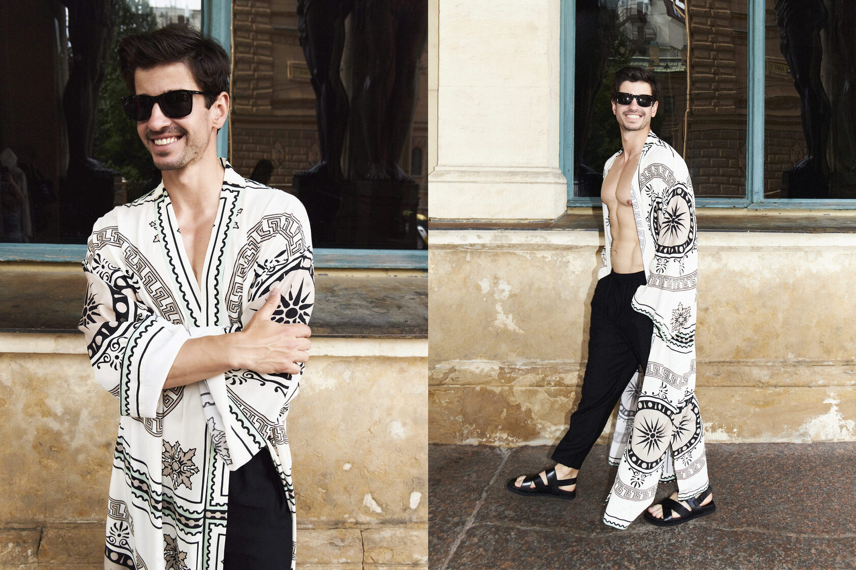 1 нарядная вещь (Халат «Memphis» с платочным принтом) + 2 спокойные (Брюки «Mick» в чёрном цвете и кожаные сандалии)